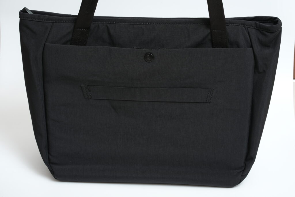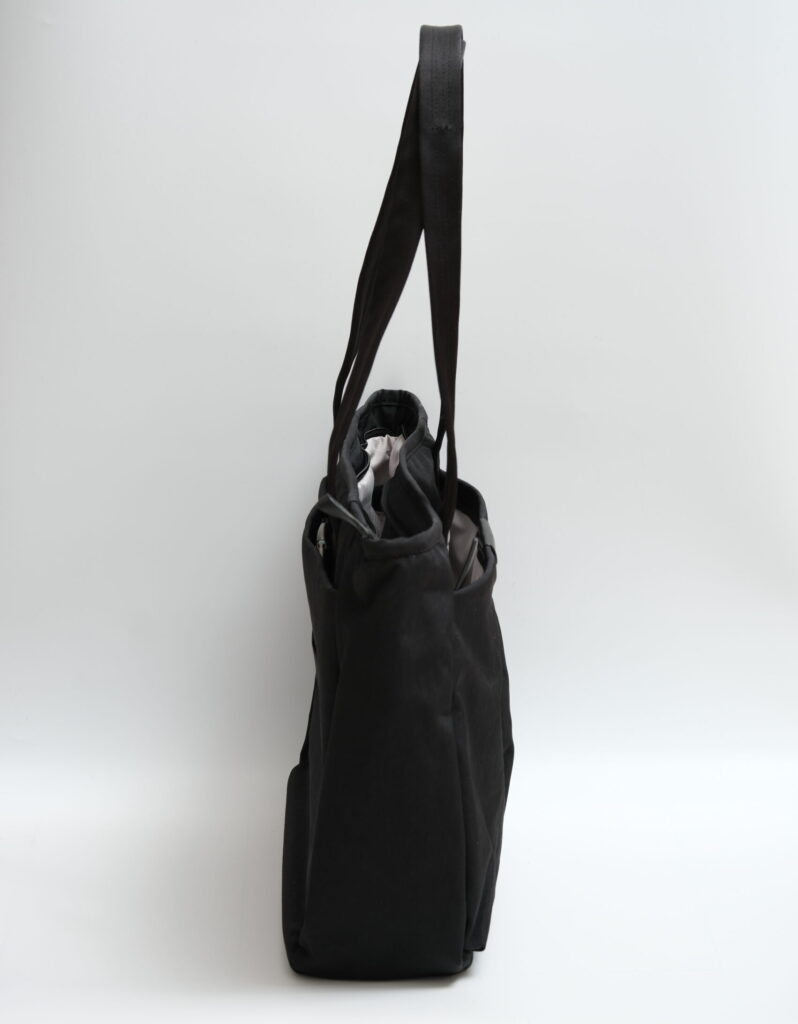 正面からの見た目。ぱっと見は普通のトートバッグですが、非常にミニマルで独特の光沢感もあり堅牢性を感じます。