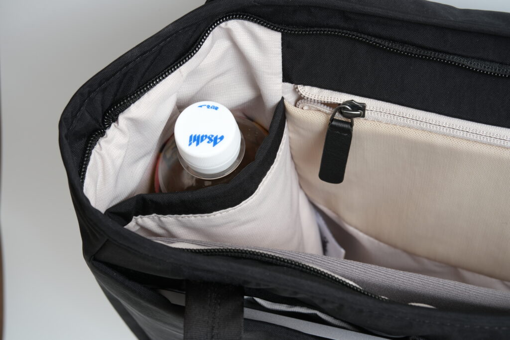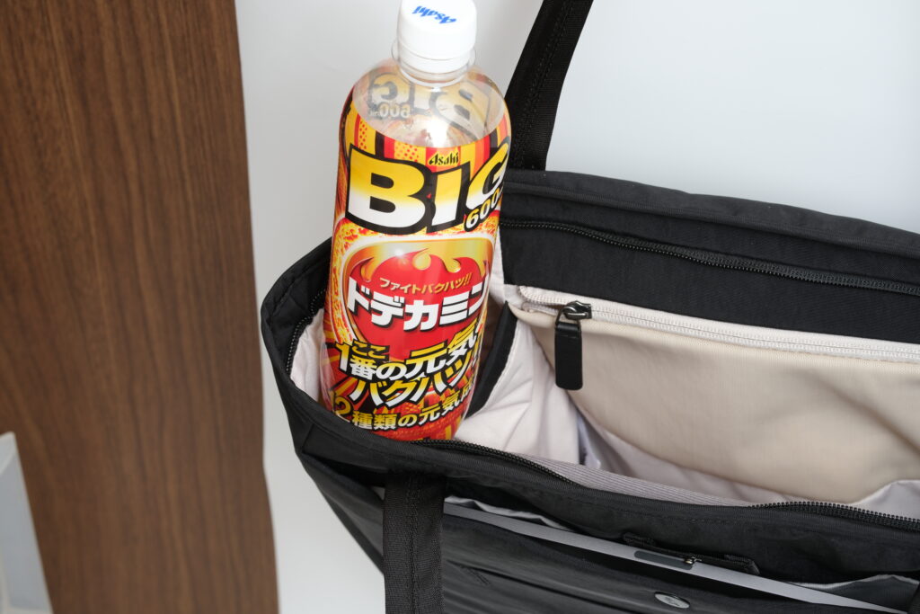 また内部サイドには縦長スリーブポケットがあるため、細長い傘やペットボトルを入れたくなると思います。