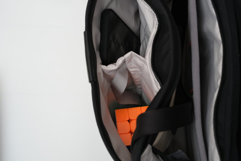 見て分かるとおり、余裕でplusサイズのスマホが入っているのと、そこそこ厚みのあるキューブが収まっている事から立体的なものでも入れられることが分かります。