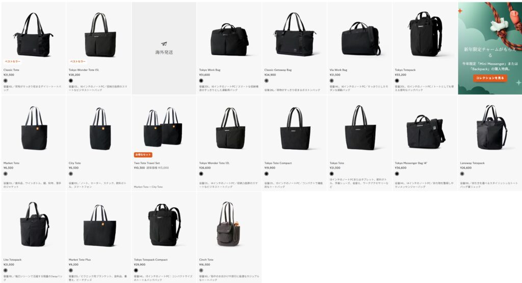 少し絞りました。今回はトートバッグとして使ってみる事に特化してみたいのでショルダーやリュックに出来そうなオプションが無いものに絞ると、以下になりました