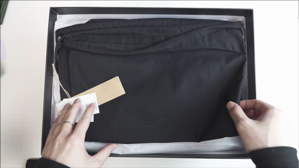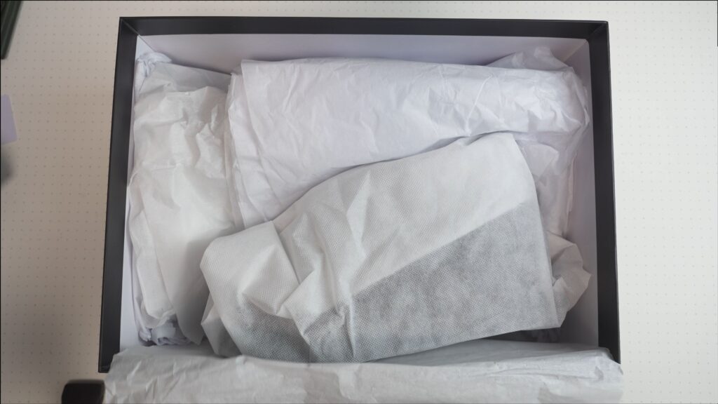ショッパーはいつもの白い紙袋だと靴の箱が収まらないため、黒い布のようなショッパーに入れてくださいました。