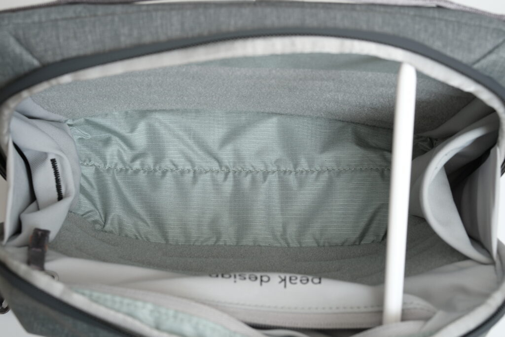 内部ボディ側。ふかふかの素材で、よく見ると仕切りがありここに小さいタブレットや本などを収納して強力に保護できます。