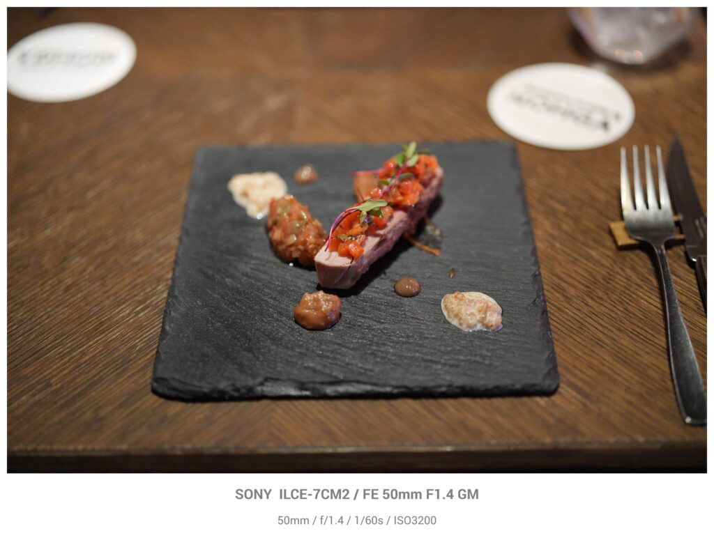 お次は食事。新宿のお店のコース料理で頂きました。角度的に被写界深度が浅すぎますが、開放で撮った時の浅い例として見て頂ければと思います。