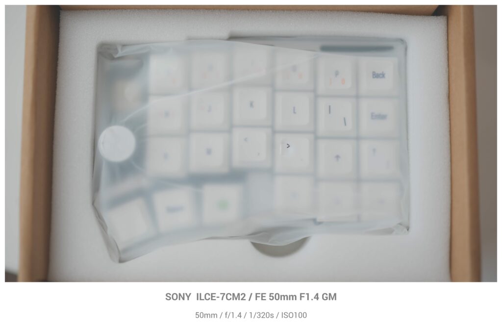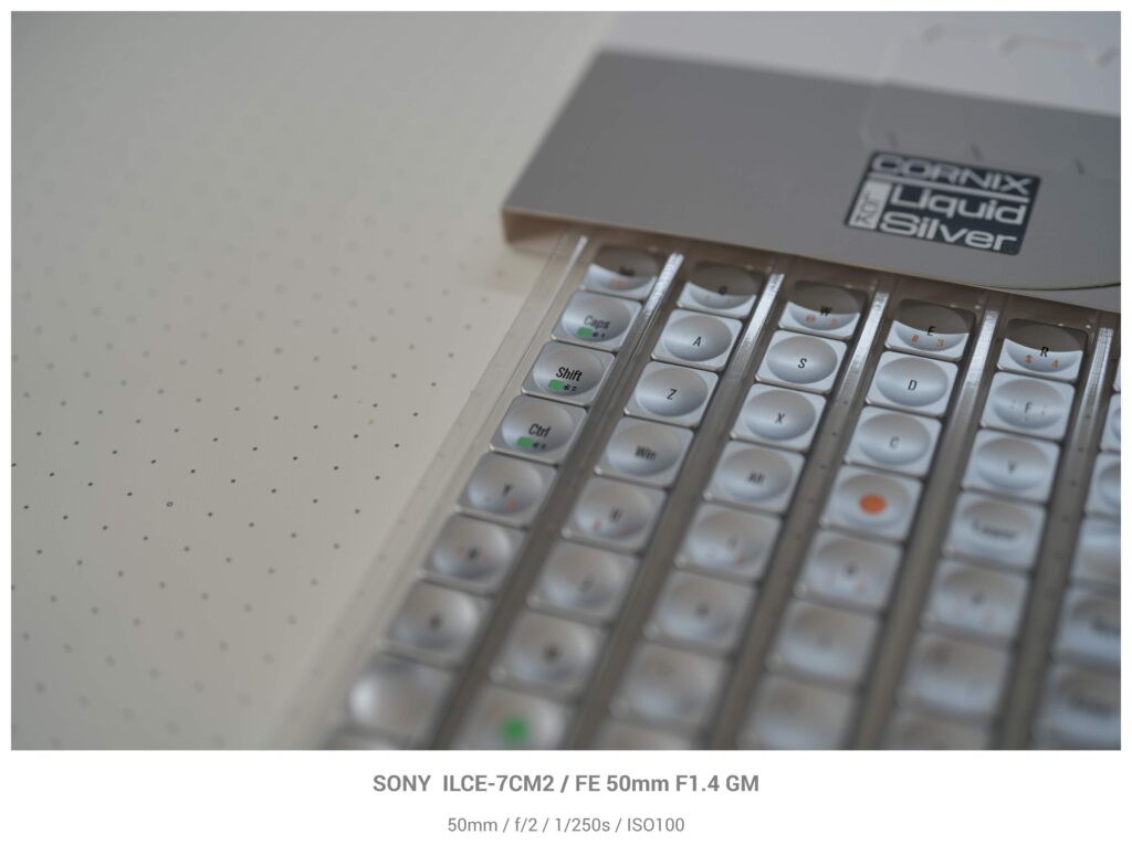 こちらはCornix LPというキーボードを製造開発しているJezailFunderさんのLAKキーキャップというキーボードのキャップですね。1段絞り込んでF2で撮影するとキーキャップがこのようにボケ始めます。